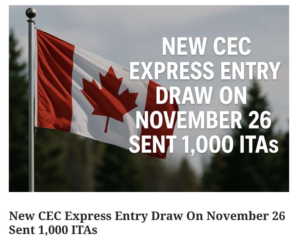 11 月 26 日,加拿大移民、难民和公民部(IRCC)再次举行 CEC 快速通道抽签,向 1000 名符合要求的候选人发出了永久居民申请邀请(ITA),CRS 分数线为 531 分。