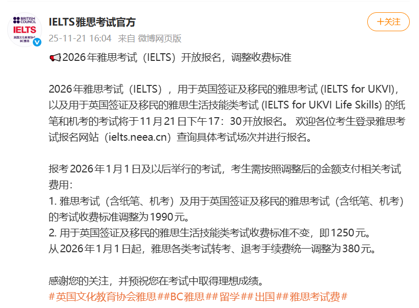 英国文化教育协会雅思(BC雅思)宣布自2026年1月1日起,雅思考试费用将迎来36年来首次下调!