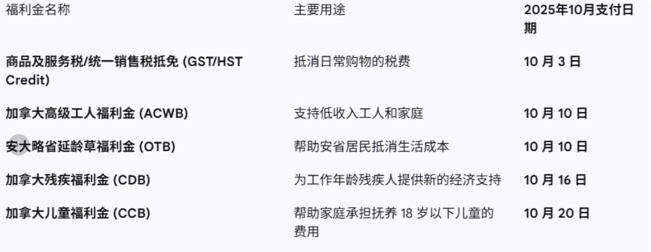 10月发放的主要政府福利及日期如下: