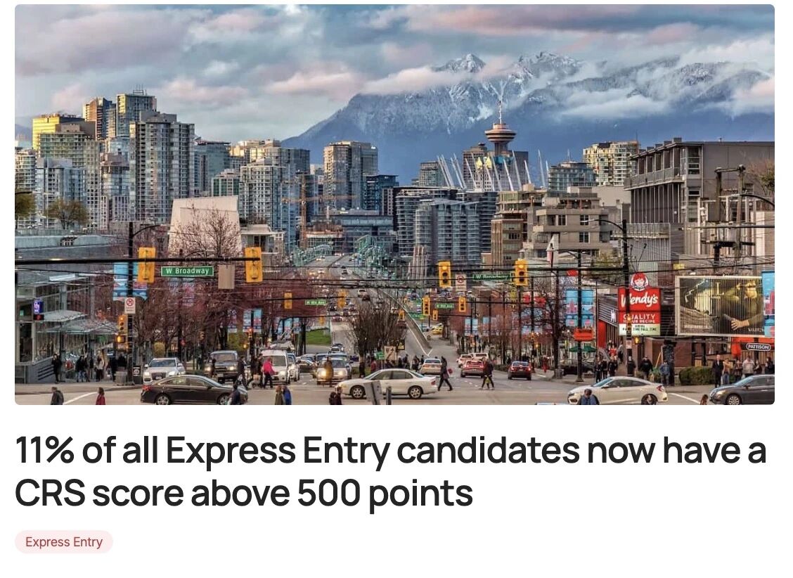 加拿大快速通道(Express Entry)候选池的最新数据公布了!截至2025年11月9日,11%的候选人CRS分数超过500分,高分候选人比例持续上升,移民竞争可谓“肉眼可见地激烈”!